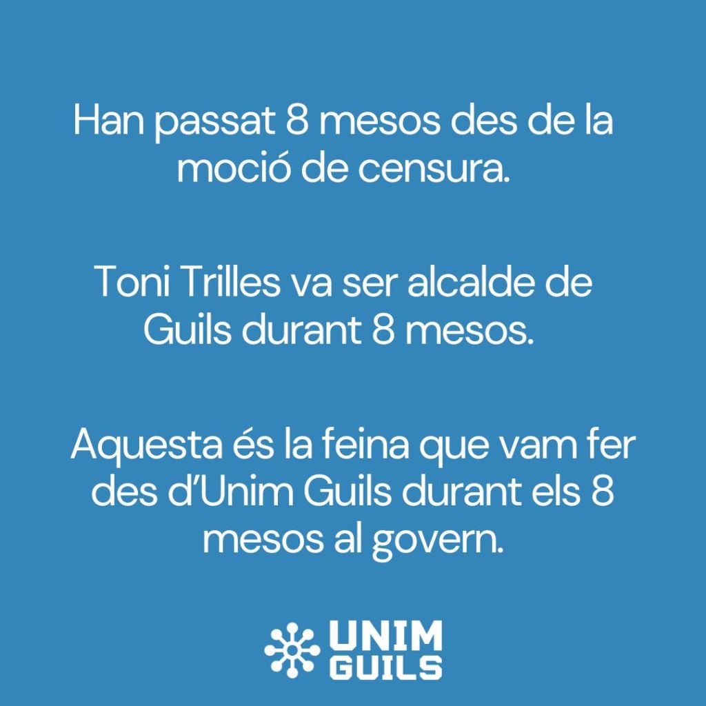 Dilluns 4 de novembre va fer 8 mesos de la moció de censura. Toni Trilles va ser alcalde de Guils durant 8 mesos. En aquest vídeo us fem un resum de la feina que vam fer des d’Unim Guils durant…