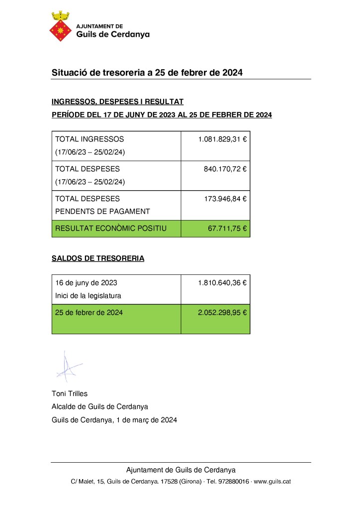 Aquest és el resum econòmic des de l’inici de la legislatura, el 17 de juny de 2023, fins al 25 de febrer de 2024.